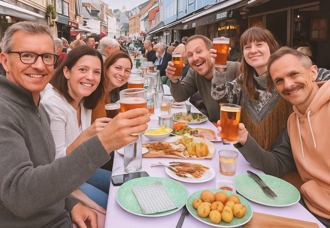 - 18.00: Velkomstdrink – Find din plads ved langbordene og nyd en drink, mens du ser gaden fyldes med glade gæster.