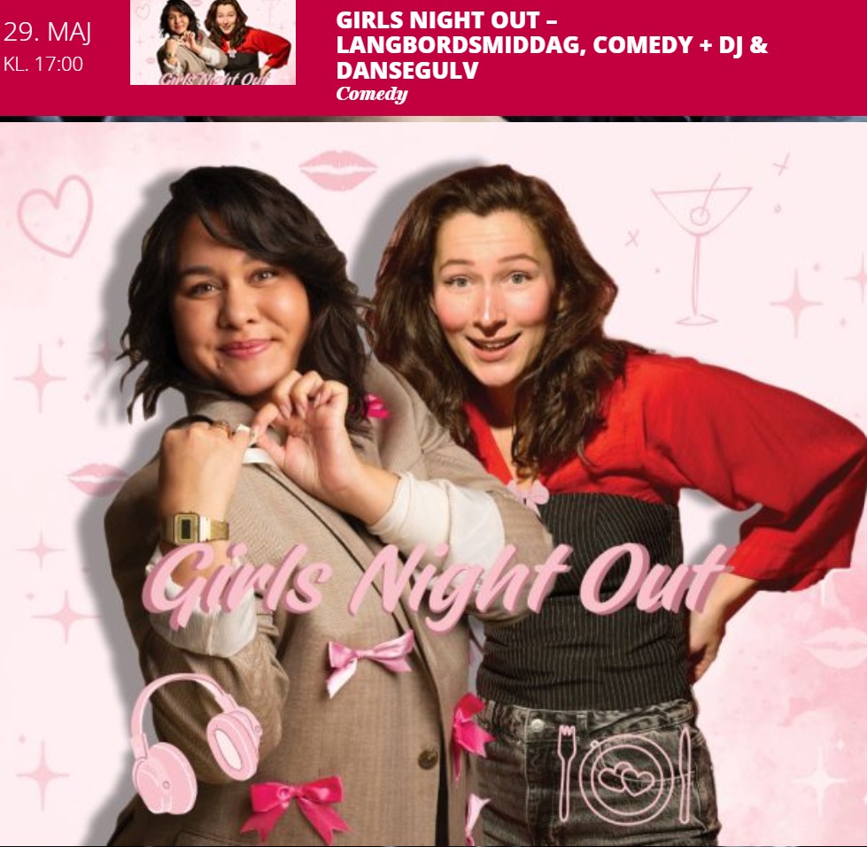 En festlig aften med langbordsmiddag, comedy med Natasha Brock og Gritt Jakobsen + DJ & dansegulv Tag en eller flere veninder under armen og få en dejlig aften med langbordsmiddag, samvær, grin og festligt selskab til Girls Night out. Inklusiv spisning