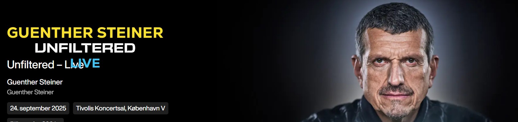Spænd sikkerhedsselen og gør dig klar til en medrivende, ufiltreret aften i selskab med tidligere teamchef for Haas F1, Guenther Steiner – kendt og elsket fra Netflix-succesen "Drive to Survive". Gode pladser på række 5, 6 og 7 midt for.
