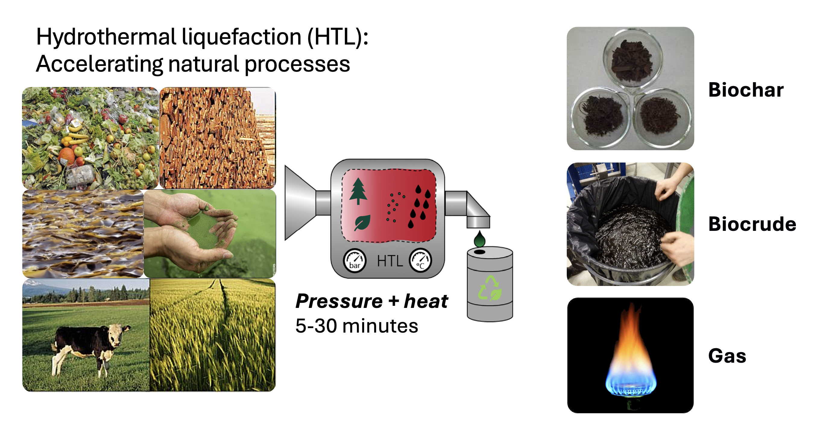 Fossil olie bliver dannet over mange millioner år gennem en naturlig geologisk proces. Organisk materiale aflejres under iltfattige forhold og under høj tryk og temperatur. HTL (HydroThermal Liquefaction) prøver at efterligne de samme forhold – på 30 min.
