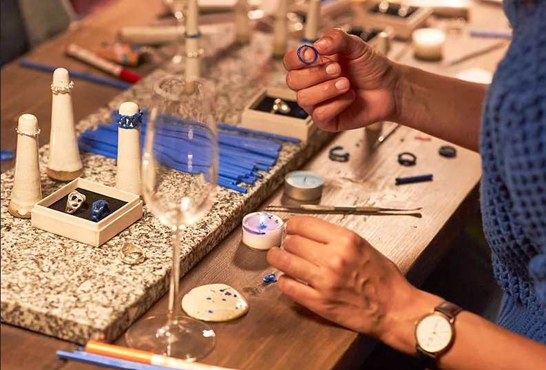 Lær at designe din egen unikke ring i voks. -herefter støbt i sølv. Cafe Livingstone sørger for en afslappet atmosfære samt vin ad libitum / Learn to design your own unique ring in wax. The atmosphere is relaxed, and the bar is free.