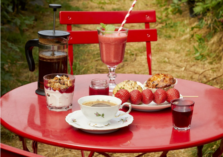 Vi åbner dagen med en brunch, der bugner af hjemmelavede lækkerier – friskbagte muffins, cremede smoothies, søde syltede bær og ikke mindst gårdens egen marmelade, der sætter prikken over i'et. Og så selvfølgelig dagens hovedrolle: de saftige, sprøde bær!