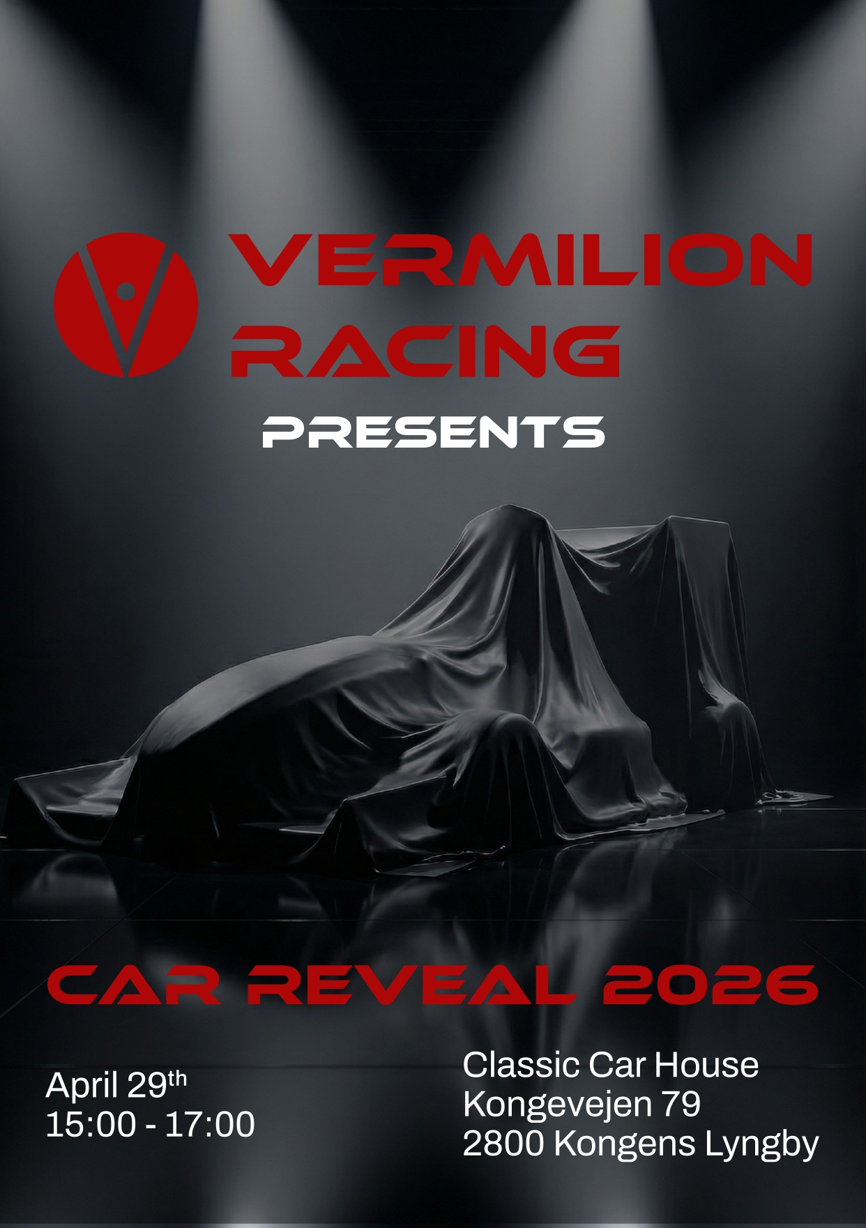 Vi kan igen i år invitere til Vermilion Racings Car Reveal 2026. Eventet finder sted den 29. april 2026 kl. 15.00–17.00 hos Classic Car House, Kongevejen 79, 2800 Kongens Lyngby.