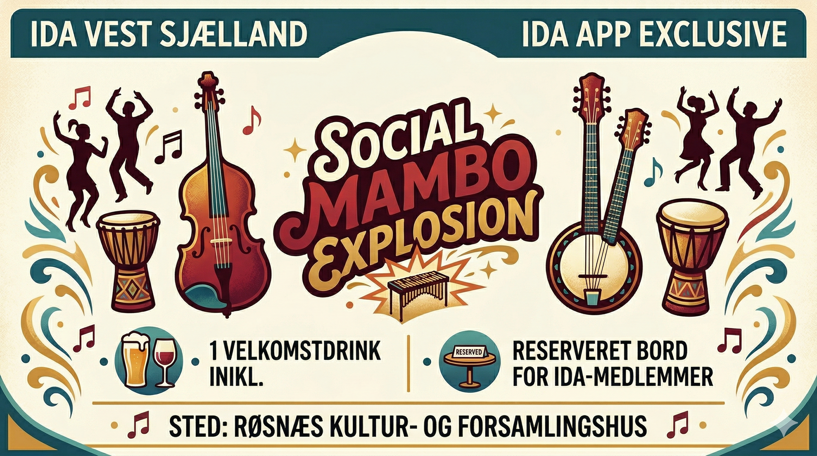 Kom ud til scenekanten og mærk rytmen! IDA Vestsjælland inviterer til en eksklusiv og eksplosiv aften i selskab med Social Mambo Explosion. Vi drager til Røsnæs for at opleve den autentiske stemning fra 1950’ernes West Coast Latin Jazz – en genre præget af præcision, varme og en uimodståelig "groove”.